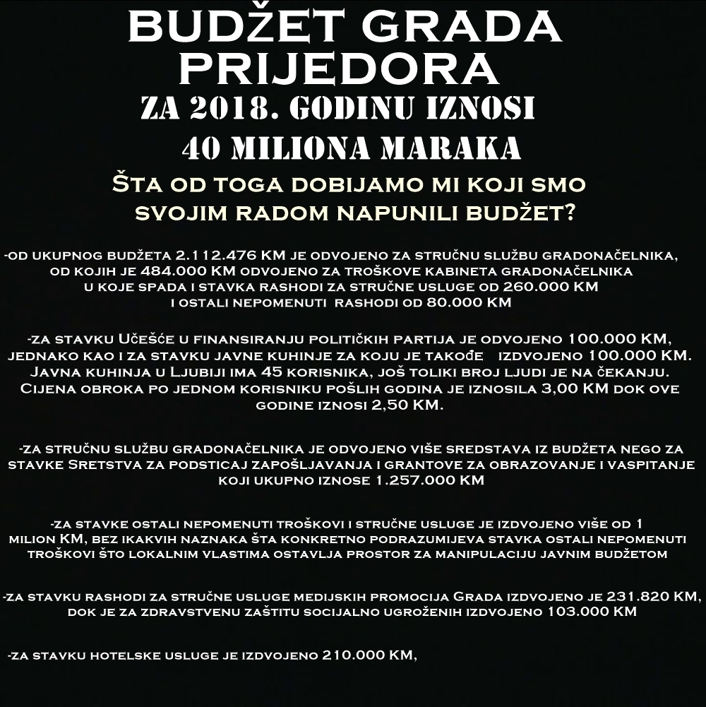 Tokom ove ulične akcije,  grupa je izložila dokumente i statistike javnog budžeta Grada Prijedora kojim je prikazana potrošnja javnog budžeta za 2017. godinu i plan potrošnje budžeta za 2018. godinu. Namjera je bila  ukazati na neravnomjernu i nepravednu potrošnju sredstava za stavke kabineta gradonačelnika za organizovanje različitih manifestacija, kupovina automobila i drugih troškova u odnosu na izdvajanja iz budžeta za, na primjer, podsticaj zapošljavanja mladih i otvaranje novih radnih mjesta, finansiranje javnih kuhinja ili drugih socijalnih davanja. ”