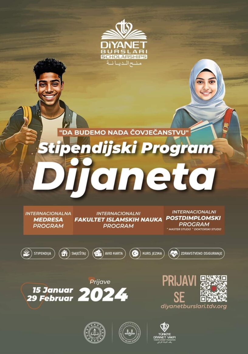 Diyanet vakuf Turske je raspisao konkurs za program stipendiranja učenika za 2024/2025. školsku/akademsku godinu za srednji obrazovni program “Međunarodna medresa” i visoki obrazovni program “Međunarodni fakultet islamskih nauka”.