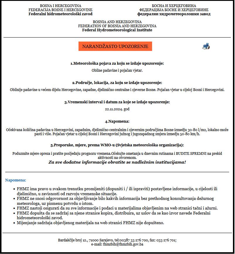 Federalni hidrometeorološki zavod (FHMZ) izdao je za petak, 22. novembar, narandžasto upozorenje zbog očekivanih obilnih padavina i pojačanog vjetra koji će zahvatiti veći dio Bosne i Hercegovine.