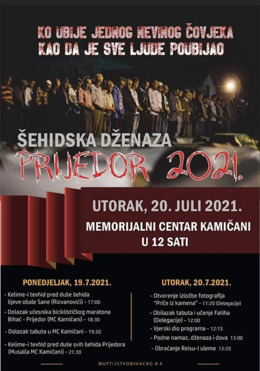 “Bihaćko muftijstvo je u proteklom periodu radilo na pripremi i organizaciji kolektivne dženaze i svih drugih aktivnosti, tako da možemo potvrditi da će sve muftije i članovi Rijaseta Islamske zajednice u BiH prisustvovati dženazi. Na ovaj ćemo se način sjetiti i odati poštovanje svim žrtvama u Prijedoru i dolini Sane. Također ćemo svi zajedno na Bajram iz Memorijalnog centra “Kamičani” poslati poruku sjećanja i poštovanja svih žrtava, ali i još jednom apelovati na nadležne državne institucije da se maksimalno angažuju u procesu traženja nestalih osoba, kako bi i one mogle biti dostojanstveno ukopane”, kazao je muftija bihaćki Mehmed ef. Kudić.