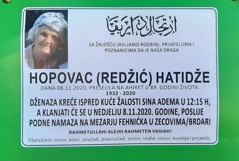 SjećanjaNa Ahiret preselila Hatidze Hopovac Posted by mojprijedor on 7 Novembra, 2020 Read Next → DruštvoPreselio je naš Emir, ali ostaje u našim srcima DruštvoEmotivna ispovijest najbližeg saradnika Halida Bešlića: 33 zajedničke godine DruštvoPreminuo je legendarni Halid Bešlić mojprijedorRead Next → DruštvoPreselio je naš Emir, ali ostaje u našim srcima DruštvoEmotivna ispovijest najbližeg saradnika Halida Bešlića: 33 zajedničke godine DruštvoPreminuo je legendarni Halid Bešlić