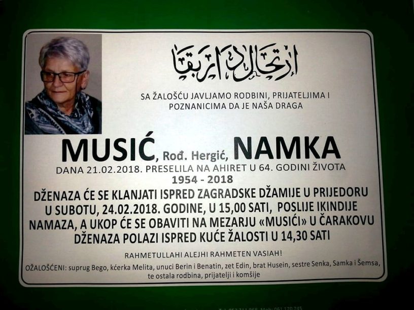 Dženaza namaz će se klanjati u subotu 24.02.2018.godine ispred Zagradske džamije u Prijedoru, u 15:00 sati, poslije ikindije namaza. Ukop će se obaviti na mezarju “Musići” u Čarakovu.