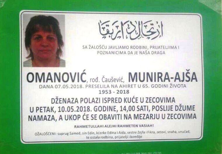 Obavještavamo rodbinu, komšije i prijatelje da je nakon kraće bolesti na ahiret preselila Omanović (Čaušević) Munira-Ajša iz Zecova. Dženaza polazi ispre kuće žalosti u petak 11.maja 2018.godine u 14:00 sati, nakon klanjanja džume namaza.