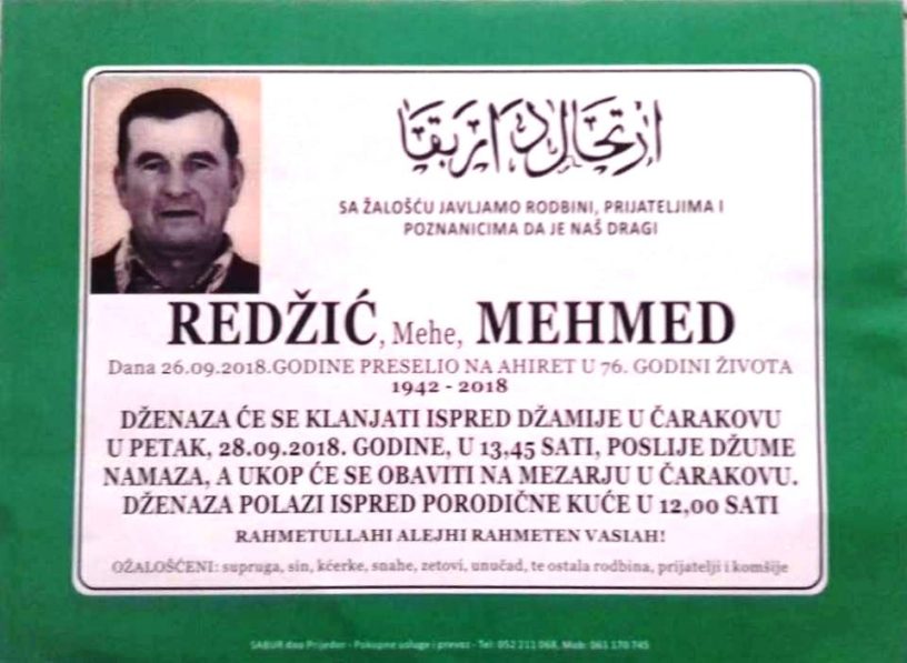 Obavještavamo rodbinu, komšije i prijatelje da je u srijedu 26.09.2018.godine, u 76 godini života na ahiret preselio Redžić (Meho) Mehmed iz Čarakova.