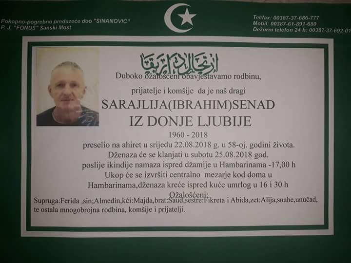 SjećanjaNa Ahiret preselio Senad Sarajlija Posted by mojprijedor on 24 Augusta, 2018 Read Next → DruštvoPreselio je naš Emir, ali ostaje u našim srcima DruštvoEmotivna ispovijest najbližeg saradnika Halida Bešlića: 33 zajedničke godine DruštvoPreminuo je legendarni Halid Bešlić mojprijedorRead Next → DruštvoPreselio je naš Emir, ali ostaje u našim srcima DruštvoEmotivna ispovijest najbližeg saradnika Halida Bešlića: 33 zajedničke godine DruštvoPreminuo je legendarni Halid Bešlić