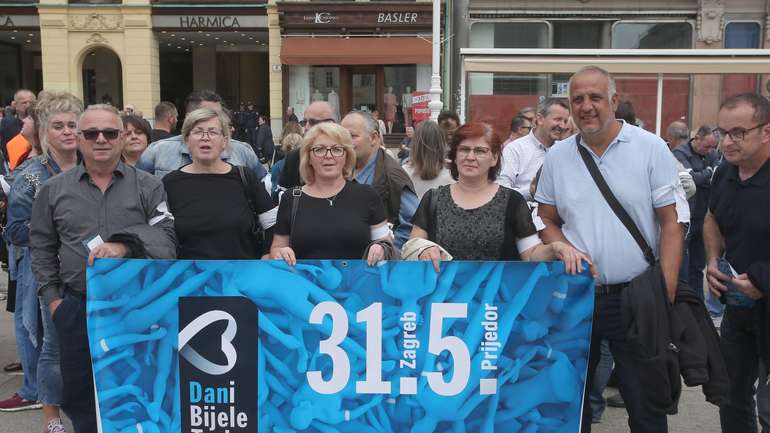 Vijeće bošnjačke nacionalne manjine Grada Zagreba (VBNMGZ) u suradnji sa Zavičajnim klubom župe Stara Rijeka i okolica u spomen na žrtve zločina koji se dogodio u Prijedoru i dolini rijeke Sane 1992. godine obilježilo je Dan bijele trake u Zagrebu na Trgu bana Josipa Jelačića ( Stipe Majic – Anadolu Agency )