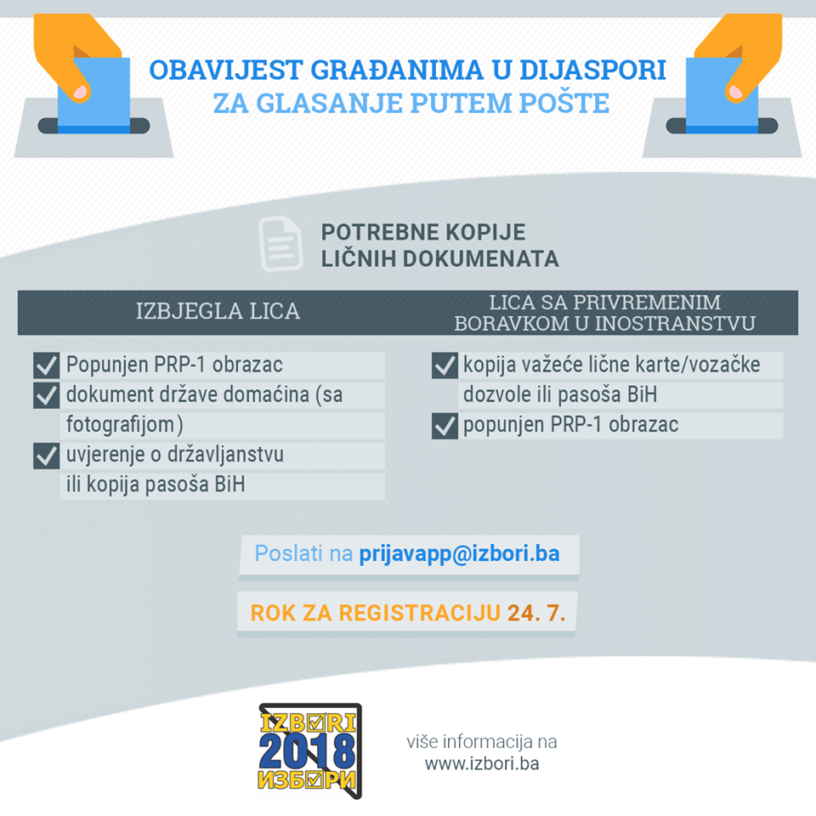 Napominjemo da se sve potrebno može obaviti prijavom u lokalnoj izbornoj komisiji u Prijedoru dolaskom u Bosnu i Hercegovinu, također najkasnije do 24.jula tekuće godine.