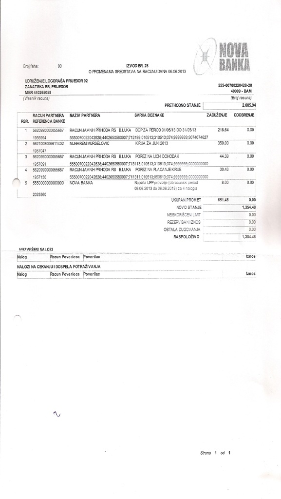 5.Izvodak iz banke za 06.06.2013.godine/Stanje na racunu Udruzenja logorasa Priejdor92