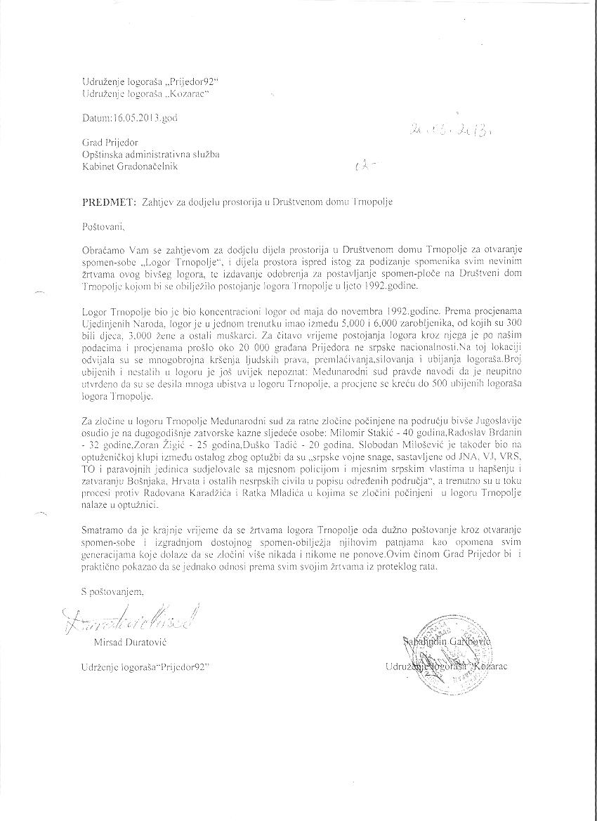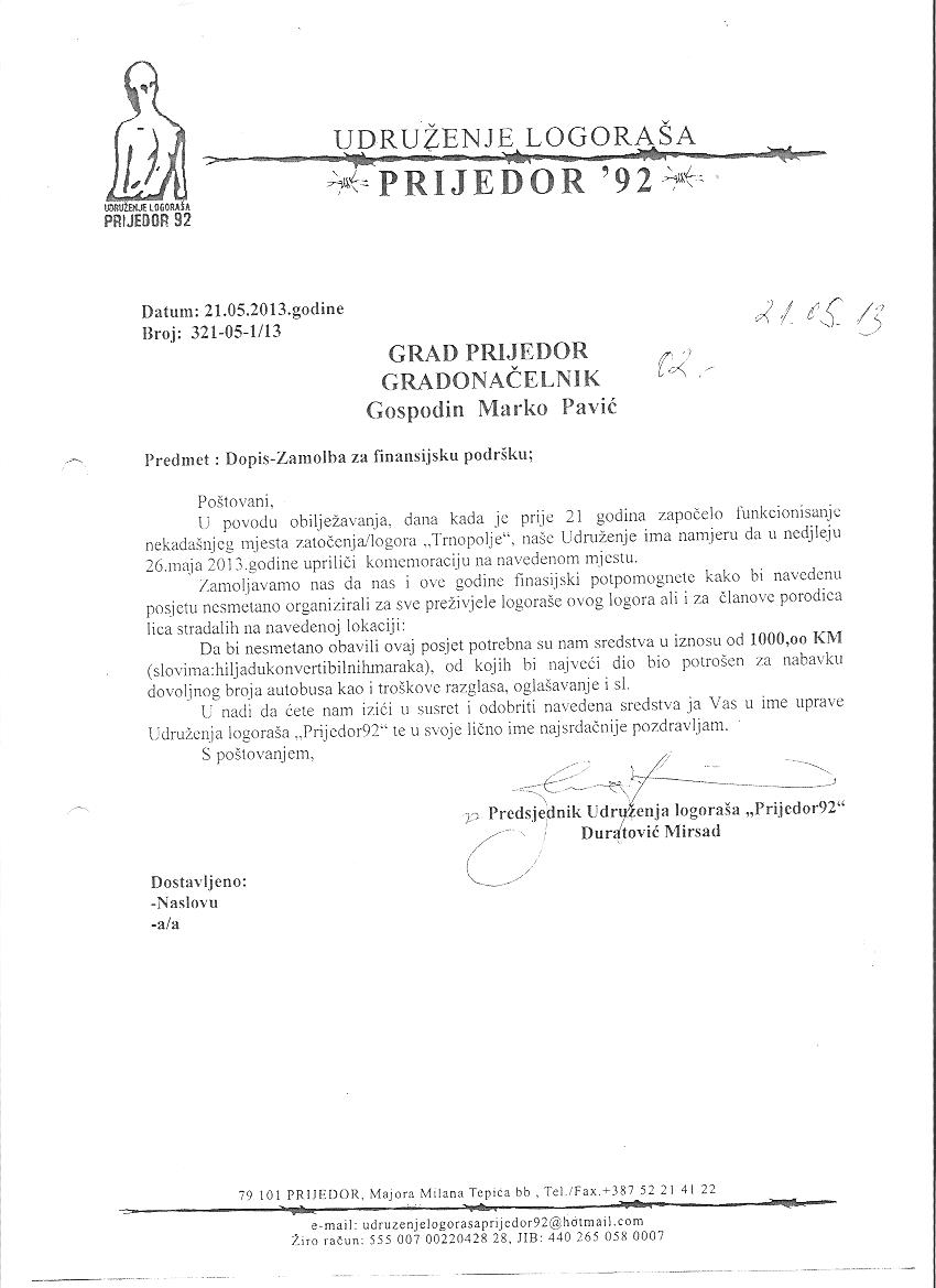 U maju mjesecu uputili smo zahtjev za finansijsku pomoć u organizaciji posjete i godišnjice logora Trnopolje na koji nismo dobili nikakav odgovor. (prilog u dopisu) Također smo isti mjesec uputili i dopis za izdavanje odobrenja za izgradnju Memorijalnog centra u logoru Trnopolje. Uljedilo nam je policijsko iznenadjenje, jer odobrenje za odrzavanje komemoracije u logoru Trnopolje nismo dobili od vlasnika prostora-grada Prijedora.