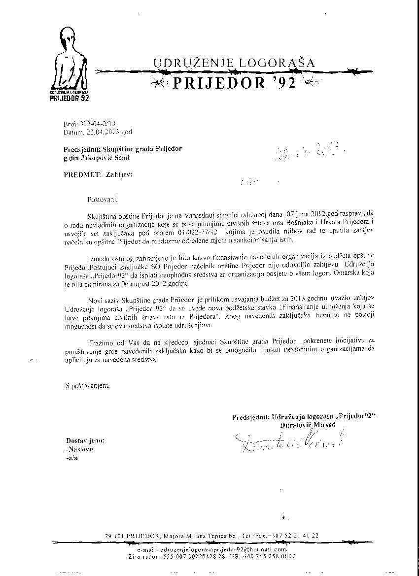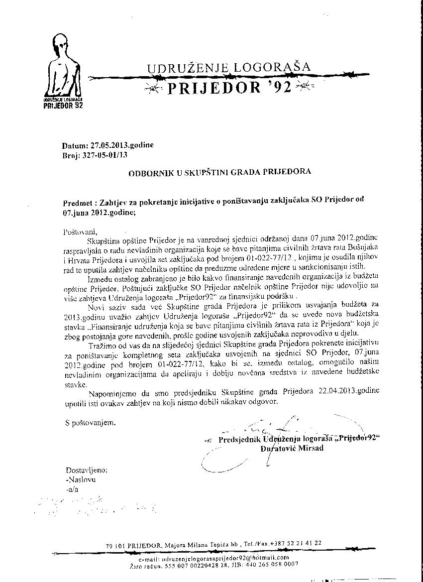 Trazili smo poništavanje sramnih Zaključaka skupstine opštine Prijedor sa sjednice održane 7. juna 2012.godine po kojima se krajnje diskriminatorski , izmedju ostalog zabranjuje svaki vid finansiranja osam udruzenja i organizacija članica koordinaconog tijela formiranog prosle godine kako bi se na najdostojanstveniji način obiljezila 20 godišnjica stradanja nevinih ljudi,žena i 103 prijedorske djece.