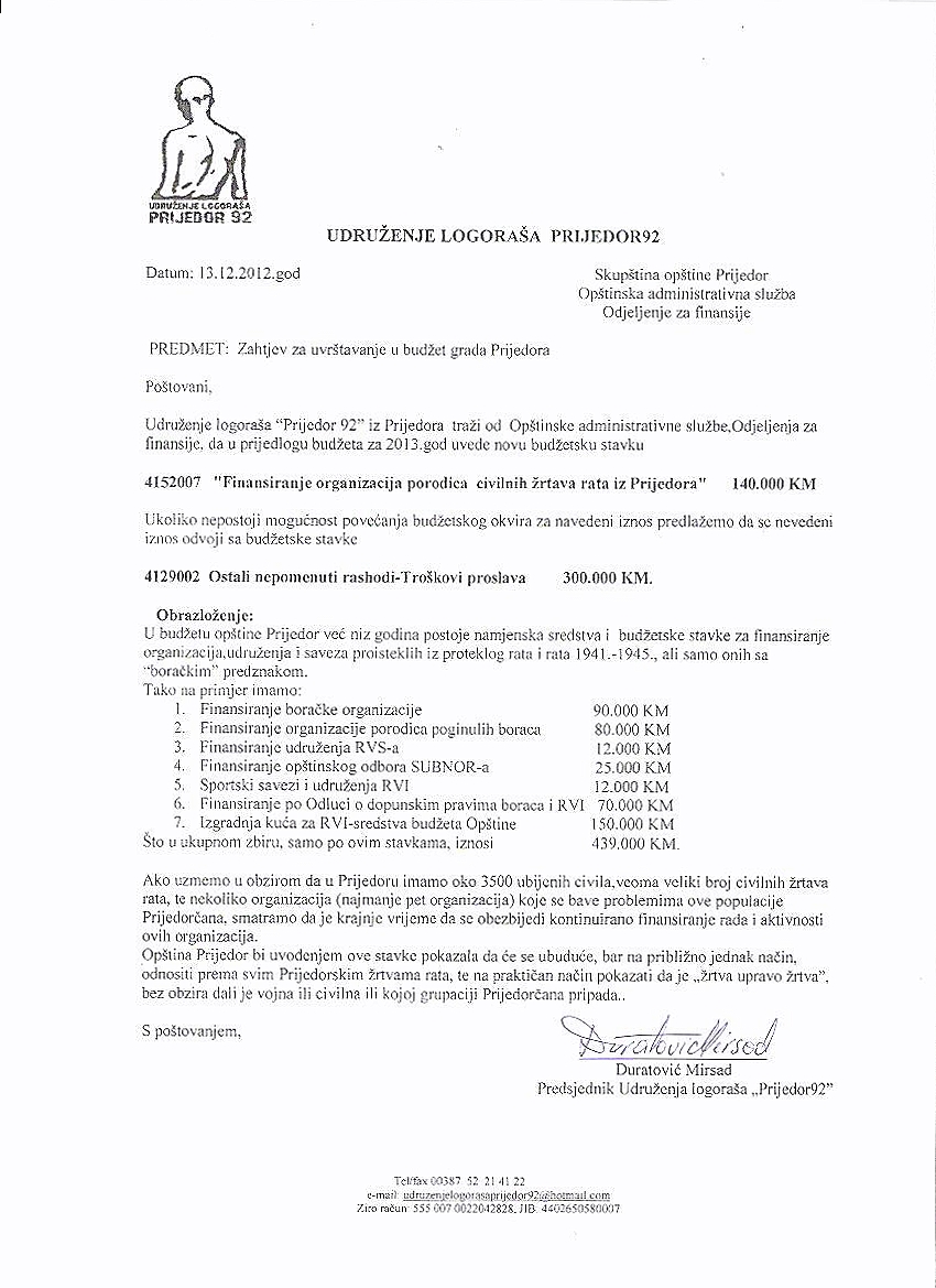 Koristeci svoje gradjansko pravo, aktivno uzevsi ucesca u javnoj raspravi a proceduri usvajanja budžeta Grada Prijedora za 2013.godinu udruženje logoraša je predložilo Amandman kojim je tražilo uvrštavanje udruženja civilnih žrtava rata iz Prijedora u budžet.(dopis u prilogu) Amandman je usvojen u iznosu od 30.000 KM a istovremeno je za boračke organizacije planirano izdvajanje u iznosu od 450.000 KM.