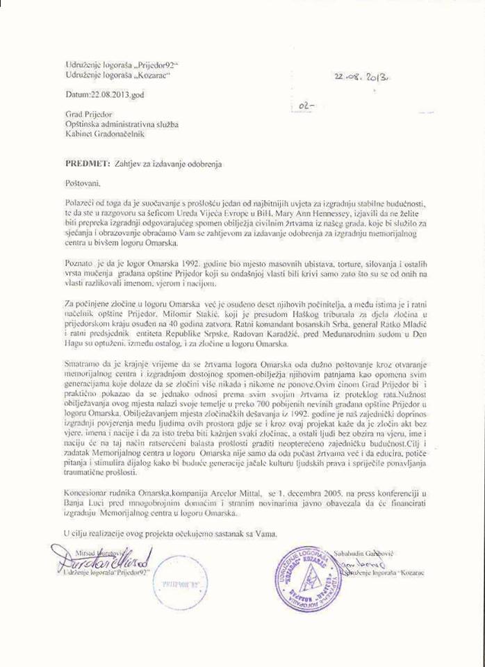 Nedugo zatim uputili smo zahtjev za izdavanje odobrenja za izgradnju memorijalnog centra u logoru Omarska. Odrzali smo sastanke i kontakte sa predstavnicima OHR-a, OSCE-a, ambasade SAD-a u Sarajevu, članom Predsjedništva BiH gospodinom Bakirom Izetbegovićem i mnogim drugima u kojima smo iznijeli našu problematiku u Prijedoru. Očigledno da smo po nekima previše govorili.