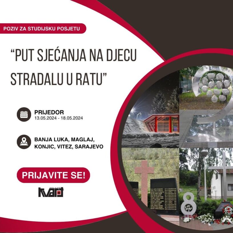 Centar za mlade “KVART” organizuje studijsku posjetu “Put sjećanja na djecu stradalu u ratu” u svrhu memoralizacije stradanja djece u ratu u Bosni i Hercegovini od 1992-1995. godine. Studijska posjeta će se održati od 13.05.2024 – 18.05.2024.