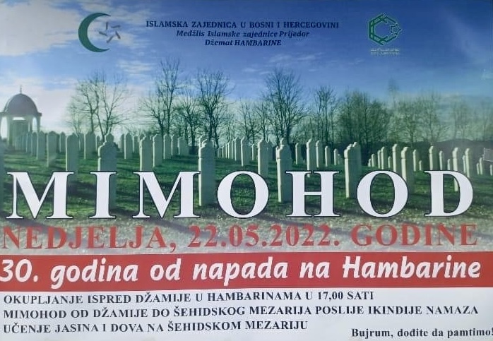 Prema informacijama koje su nam potvđene u Medžlisu islamske zajednice Prijedor u džematu Hambarine predviđeno je nekoliko sadržaja. Tako je za 17 sati ispred džamije u Hambarinama najavljeno okupljanje učesnika mimohoda koji će se nakon ikindije namaza uputiti prema šehidskom mezarju. Učenjem jasina i dova prisutni će se prisjetiti nevinih žrtava.